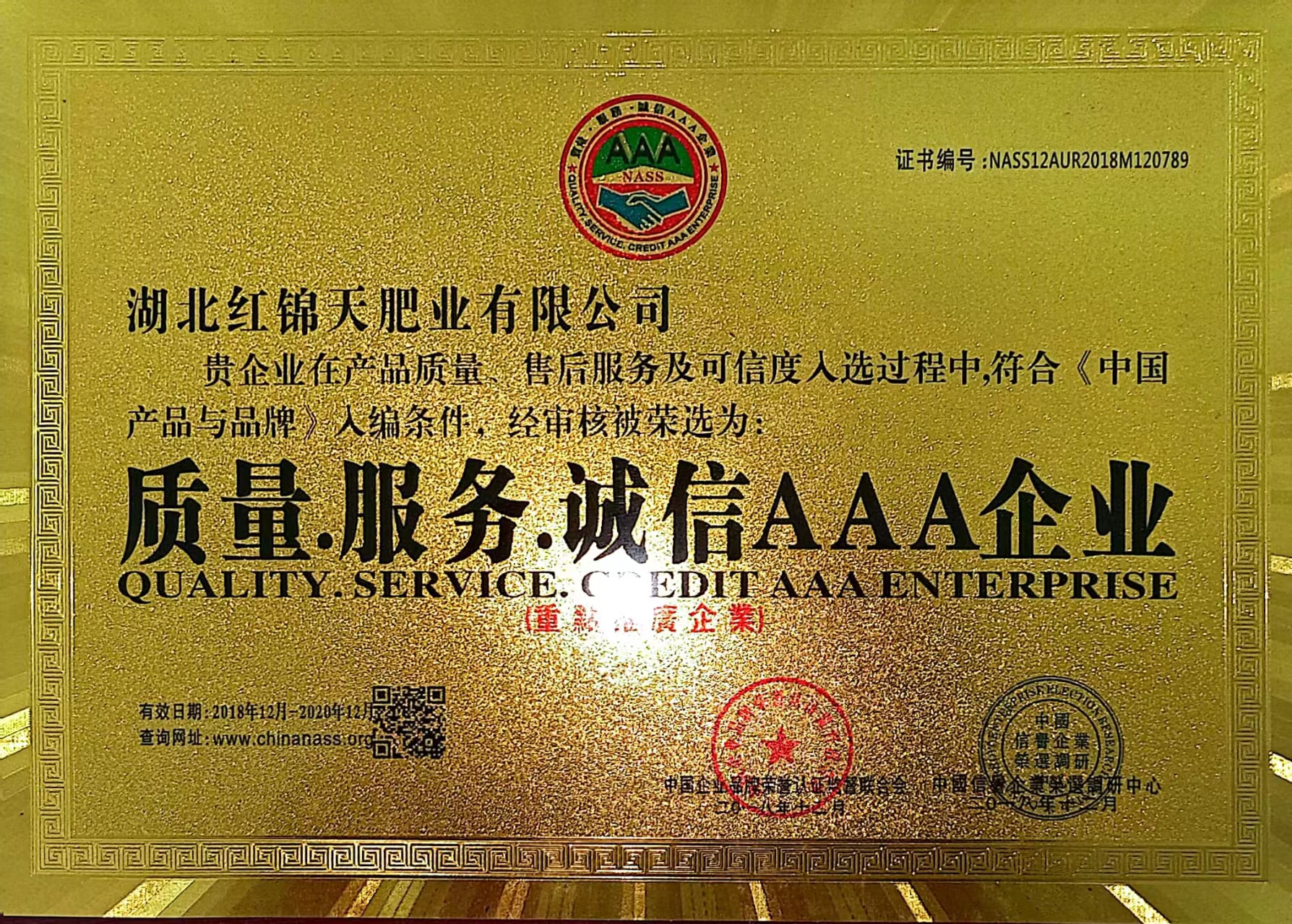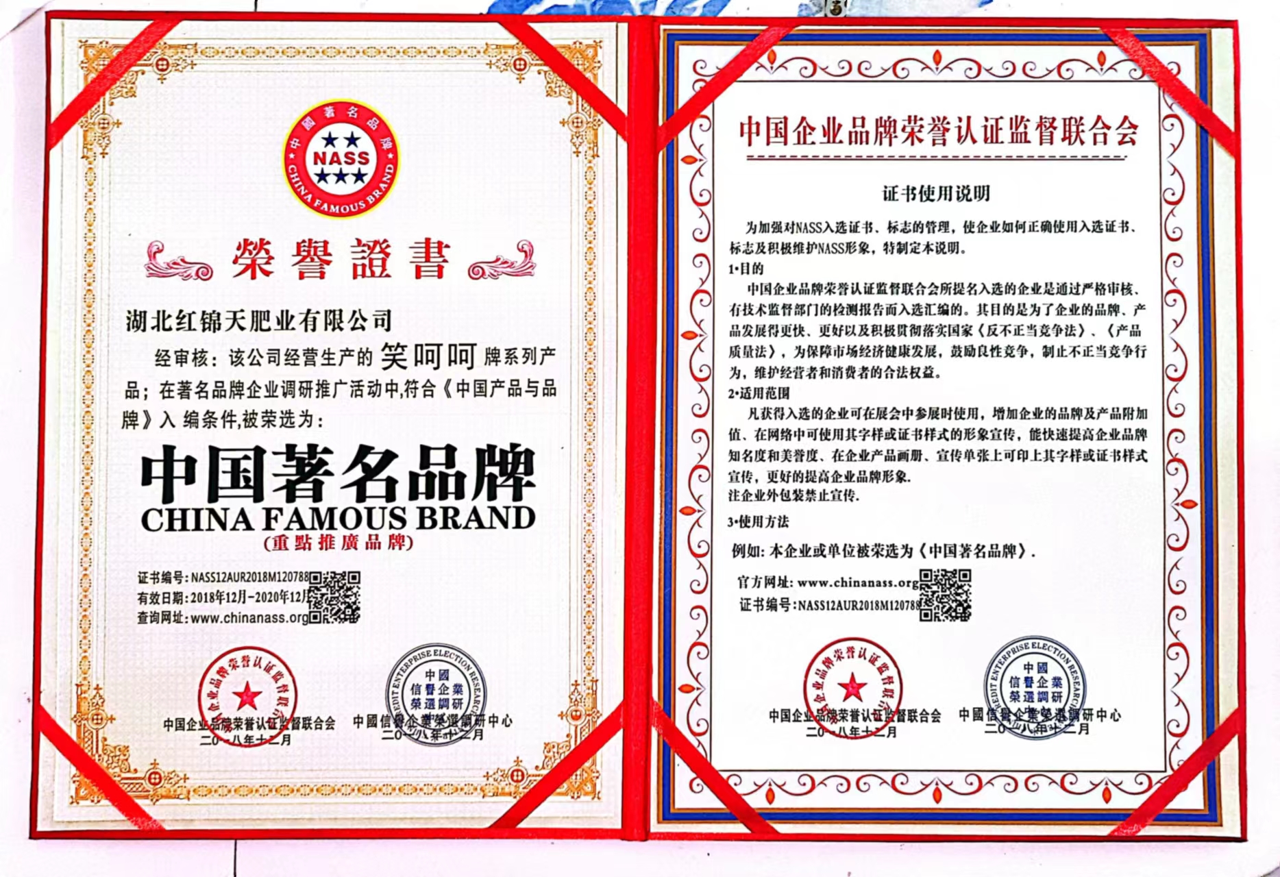 资质荣誉: 经NASS对产品知名度、产品质量、及售后服务可信度认证后,湖北红锦天肥业公司被认证为AAA级公司,其名下品牌“笑呵呵”认证为中国知名品牌。 湖北红锦天肥业在发展过程中立足远方,不断超越,坚持以信誉立企,以责任立业,坚持合作共赢。一路走来,从零开始至今,代理商已遍及湖北、河南、云南、四川、贵州、广西等地区,同时我们时刻自省,居安思危、从不满足,在正确认识自身、认清自身的基础上,加强学习,不断提高,为终端农民用户与中端代理合作商提供更有价值的产品与服务。